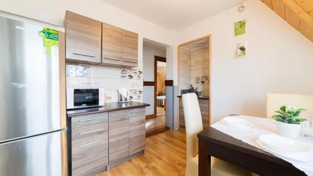 - w budynku, w którym mieszkamy: w pełni wyposażony, ogólnodostępny aneks kuchenny (czajnik elektryczny, kuchenka mikrofalowa, lodówka, oraz zastawa stołowa i sztućce), narciarnia z suszarnią, siłownia wyposażona m.in. w atlas i rower magnetyczny firmy kettler, orbitrek,